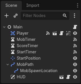 Now that we're done creating the HUD scene, go back to Main. Instance the HUD scene in Main like you did the Player scene. The scene tree should look like this, so make sure you didn't miss anything:
