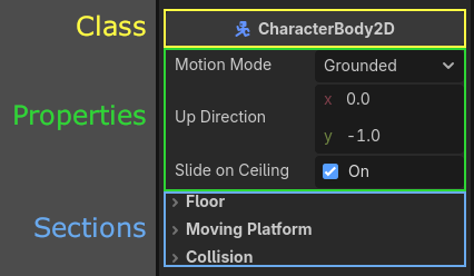 If a node has exported variables in its attached script, you will also see these in the inspector. The first image in this section has one for the Player node: Action Suffix. See GDScript exported properties for more on this topic.